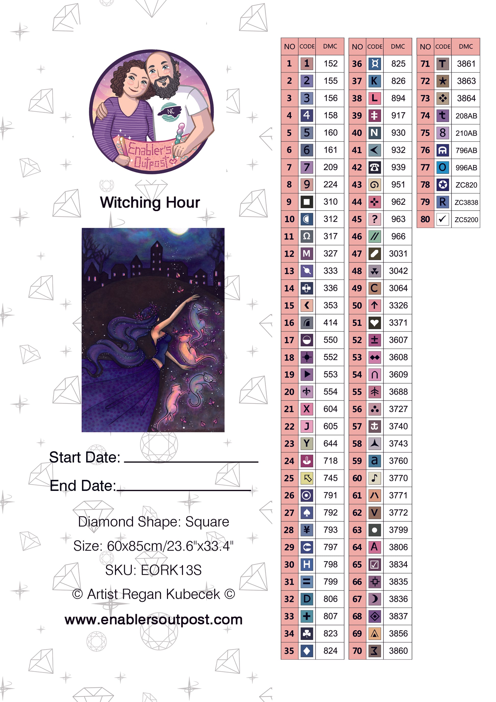 Kit details: 60x85cm, square resin drills. 80 colors including 4 AB and 3 Shimmer drills already charted in at no additional cost.
